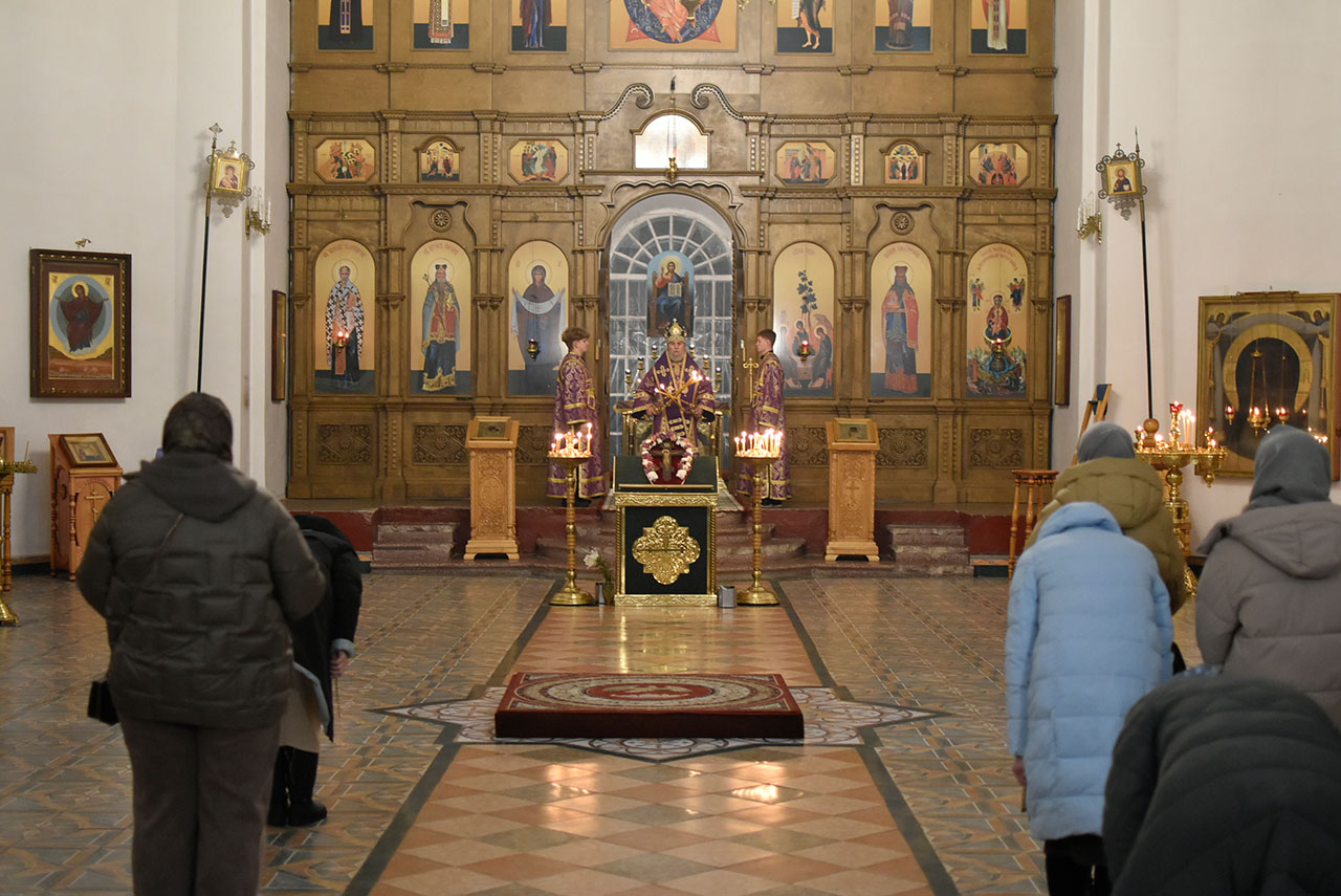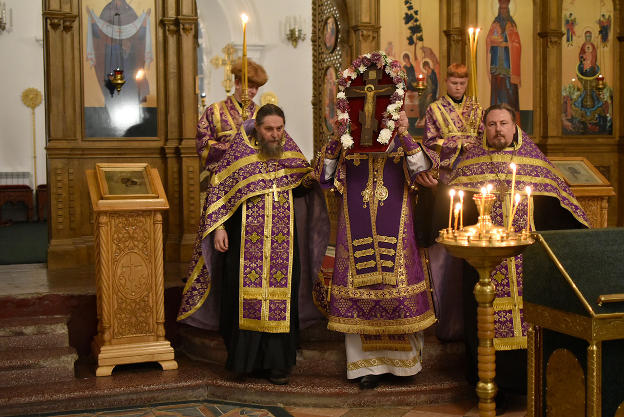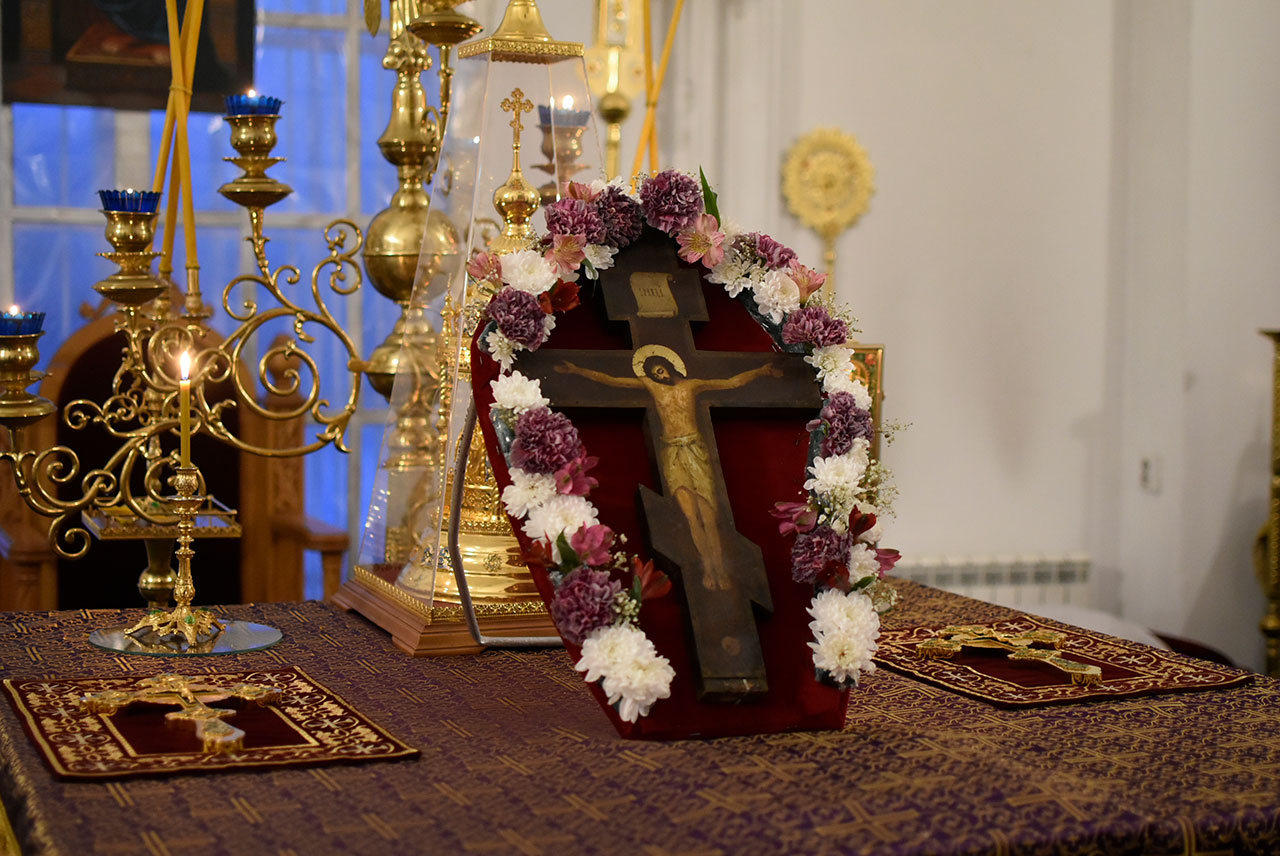 За богослужением архипастырь совершил вынос украшенного цветами Честного и Животворящего Креста Господня на середину храма с земными поклонами и пением тропаря: «Кресту Твоему покланяемся, Владыко, и святое воскресение Твое славим».